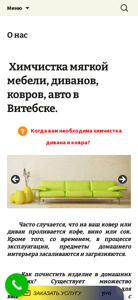 | AI-анализ | This website is a home cleaning service in Vitsebsk, Belarus, specializing in cleaning soft furniture, sofas, and carpets. The service offers on-site cleaning for sofas, carpets, and rugs in Vitsebsk and the surrounding area. The website states that there is a free service call to Vitsebsk. Pricing and services are provided. The company cleans soft furniture and mattresses, carpets and rugs, and car interiors. The website mentions that stains on furniture and carpets, such as coffee, wine, or juice, can be difficult to remove with home remedies and may damage the items or their appearance. Professional cleaning with special cleaning agents and equipment can effectively remove stains without damaging the furniture or carpets. The company has over 10 years of experience in this field and claims a 93% |