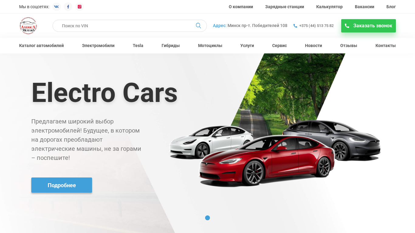 | SEO-описание | AMERICA MOTORS - самый большой выбор Новых и БУ электрокаров в наличии и под заказ. Представительства в регионах РБ. Электромобили из США и Канады. |