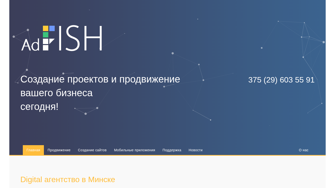 | AI-анализ | The web project "AdFISH" is a digital agency based in Minsk, Belarus, offering internet marketing services. The company has been successfully creating and promoting online projects for over 8 years. Their professional team follows modern approaches and effective tools. Specialists at AdFISH deeply understand the specifics of each business and are committed to the success of each project. Individualized solutions ensure accurate reflection of each company's unique characteristics. AdFISH values clients' success and provides timely consultations and reliable support. Created projects bring long-term profit and online business growth. The agency offers services for website promotion and comprehensive internet marketing, including analysis of competition, strategy development, and maximum attraction of targeted traffic. Additionally, they have a skilled team of website and mobile app developers for iOS and Android. Clients are encouraged to contact them at +375 29 603-55-91 for |