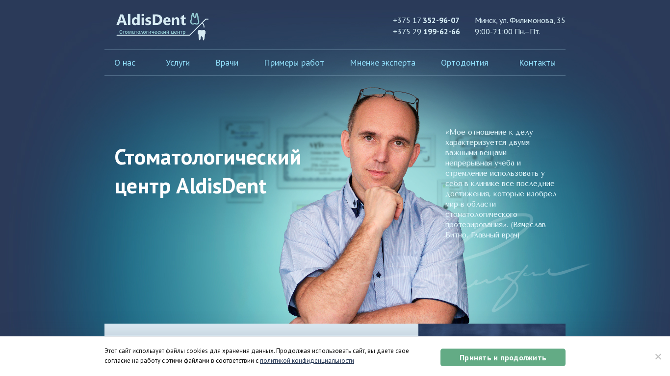 | AI-анализ | This website belongs to a dental clinic named Вячеслава Битно in Minsk, Belarus. It is one of the most high-tech medical centers equipped with advanced tools for diagnosing, treating, implanting, and prosthetizing teeth. The website is operated by AldisDent, an organization based in Minsk with a Facebook presence. The logo of AldisDent is a square image of size 332x148 pixels. The website is in Russian language and provides a search function for users. |