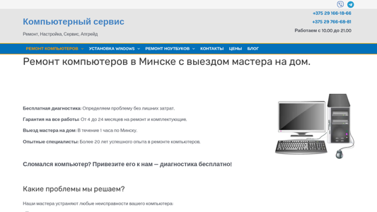 | SEO-описание | Компьютер сломался? Ремонт в Минске на дому. Бесплатная диагностика, цены от 20 руб. Гарантия 12 мес. |