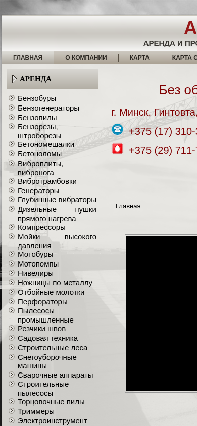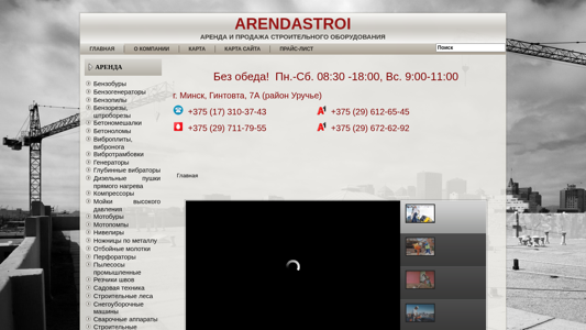 | AI-анализ | This website is a rental and sales platform for construction equipment owned by the Belarusian company Arendastroi. The title of the website is "Ренда и продажа строительного оборудования" (Rental and sales of construction equipment), while the description specifies that the company offers equipment rental for physical and legal entities without the need for a loan. The website provides a wide range of construction equipment for various purposes, including compressors, generators, concrete mixers, drilling equipment, saws, and more. The data includes a list of top words related to the website, such as "оборудования" (equipment), "аренда" (rent), "пушки" (pumps), and "продажа" (sales). The website also offers repairs for both electrical and gas-powered equipment and provides contact information. The website design includes a frontpage |