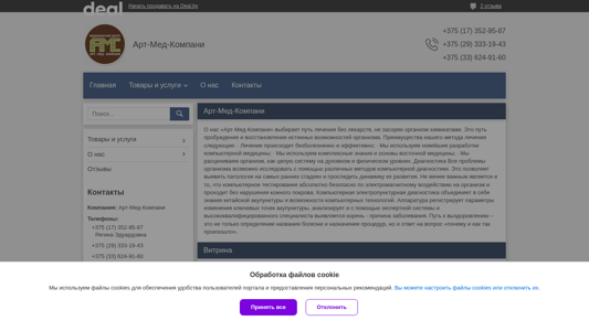 | AI-анализ | The website "Арт-Мед-Компани" (art-med-company.deal.by) is an online platform offering contacts, products, and services for a medical company. The site includes contact information for phone numbers +375 (17) 352-95-87, +375 (17) 333-19-43, and +375 (17) 624-91-60, as well as the name Regina Eduardovna. The website is registered in Belarus and has a focus on medicinal services, including diagnostics and dietology. The keywords used on the site include 'услуги' (services), 'арт-мед-компани' (Art-Med-Company), 'регина' (Regina), 'эдуардов |