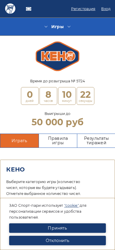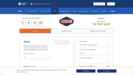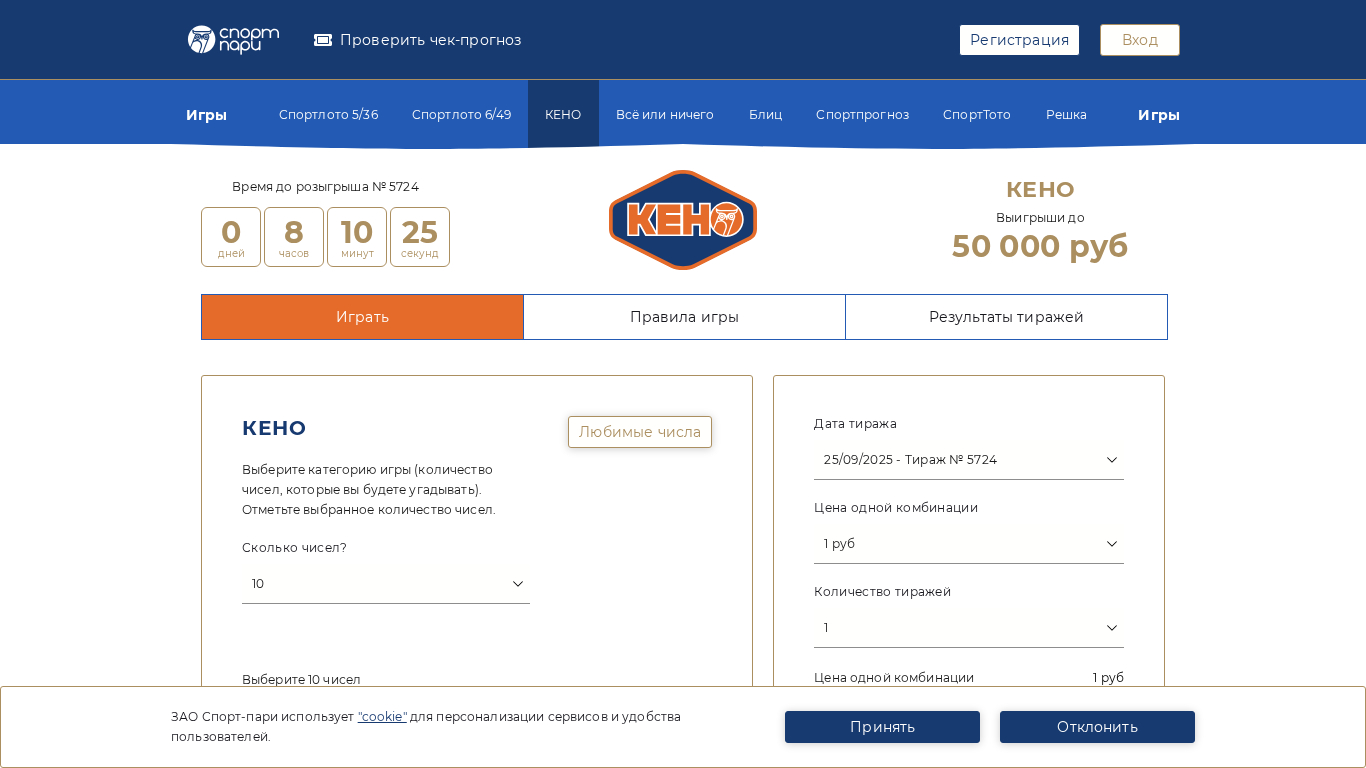 | SEO-описание | Принимайте участие в игре «КЕНО» на официальном сайте компании Спорт-пари в Беларуси. Ставки от 1 BYN. Выигрыши до 50 000BYN |