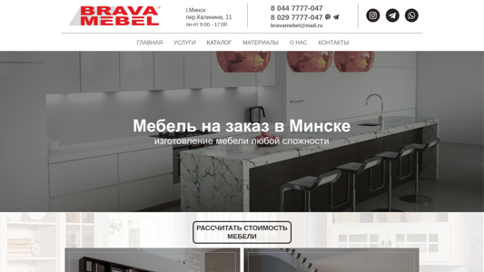 | AI-анализ | The website is a furniture manufacturing and sales company based in Minsk, Belarus. The title of the website translates to "Furniture for order in Minsk cheaply, order furniture in Minsk." The description mentions the production of furniture to individual orders at an affordable price, with a rating of five stars. The company produces furniture of any complexity and provides contacts for inquiries, with phone numbers +375 (44) 7777-047 and (29) 7777-047. The website has keywords related to furniture, order, Minsk, and the company name "BravaMebel." The top words include "мебель" (furniture), "заказ" (order), and "минск" (Minsk). The code of the website includes CSS adjustments for various screen sizes and font |