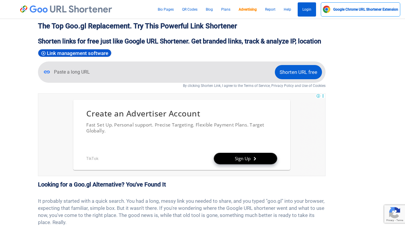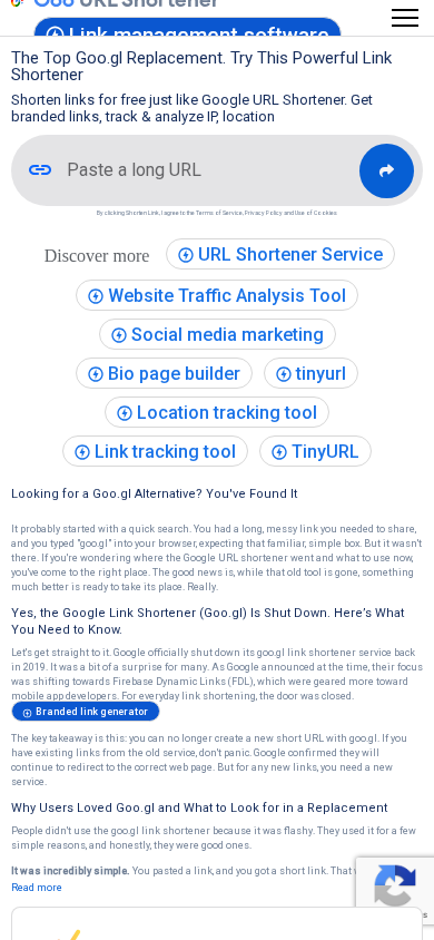 The web project "Goo.gl Alternative: The Best Free URL Shortener" is an online platform that offers a free Google-like link shortener service with advanced analytics and custom URL options. The website's primary goal is to provide users with a simple and efficient solution for shortening their links, similar to the discontinued Google URL shortener (goo.gl). The platform offers features such as branded links, IP and location tracking, and customization options. It also includes a blog, plans, advertising, and a report section, among other offerings. The website's content is focused on informing users about the shutdown of the Google URL shortener and introducing them to this alternative service. Keywords related to the project include "goo.gl," "URL shortener," "short URL," "bitly," "tinyurl," and "tiny URL." Top words on the website include "the