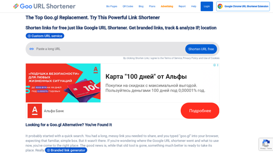 | AI-анализ | --- This website is an alternative to the Google URL shortener service, goo.gl. It offers users a free URL shortening service with advanced analytics and custom URL options. The website is called 'Goo URL Shortener' and includes features such as branded link generator, IP and location tracking, QR code generation, blog, plans, advertising, report, and help login. Users can shorten links in a similar way to goo.gl, but with additional customization options. The website also offers a Google Chrome URL Shortener Extension for easy use. Although Google officially shut down their goo.gl link shortener service in 2019, existing links from the old service will continue to be redirected to the correct web page. For new links, users need to use a replacement service such as this one. The website targets users who are looking for a simple and effective URL shortener with advanced features, similar |
