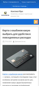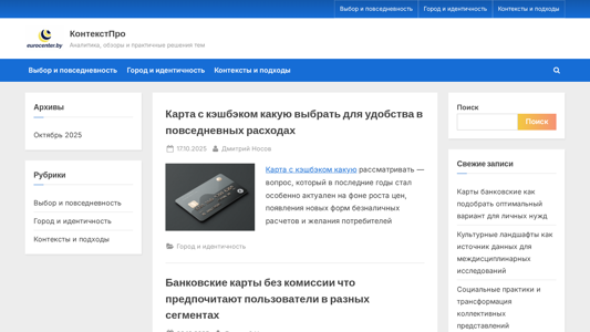 | AI-анализ | The web project "КонтекстПро" offers analysis, reviews, and practical solutions to various topics. The content covers themes such as choice and everyday life, city and identity, contexts and approaches. The articles discuss topics like selecting a cashback credit card for everyday use, banking cards without commissions, and the role of cultural landscapes as a source of interdisciplinary research. The website provides insights and practical advice on various subjects. |