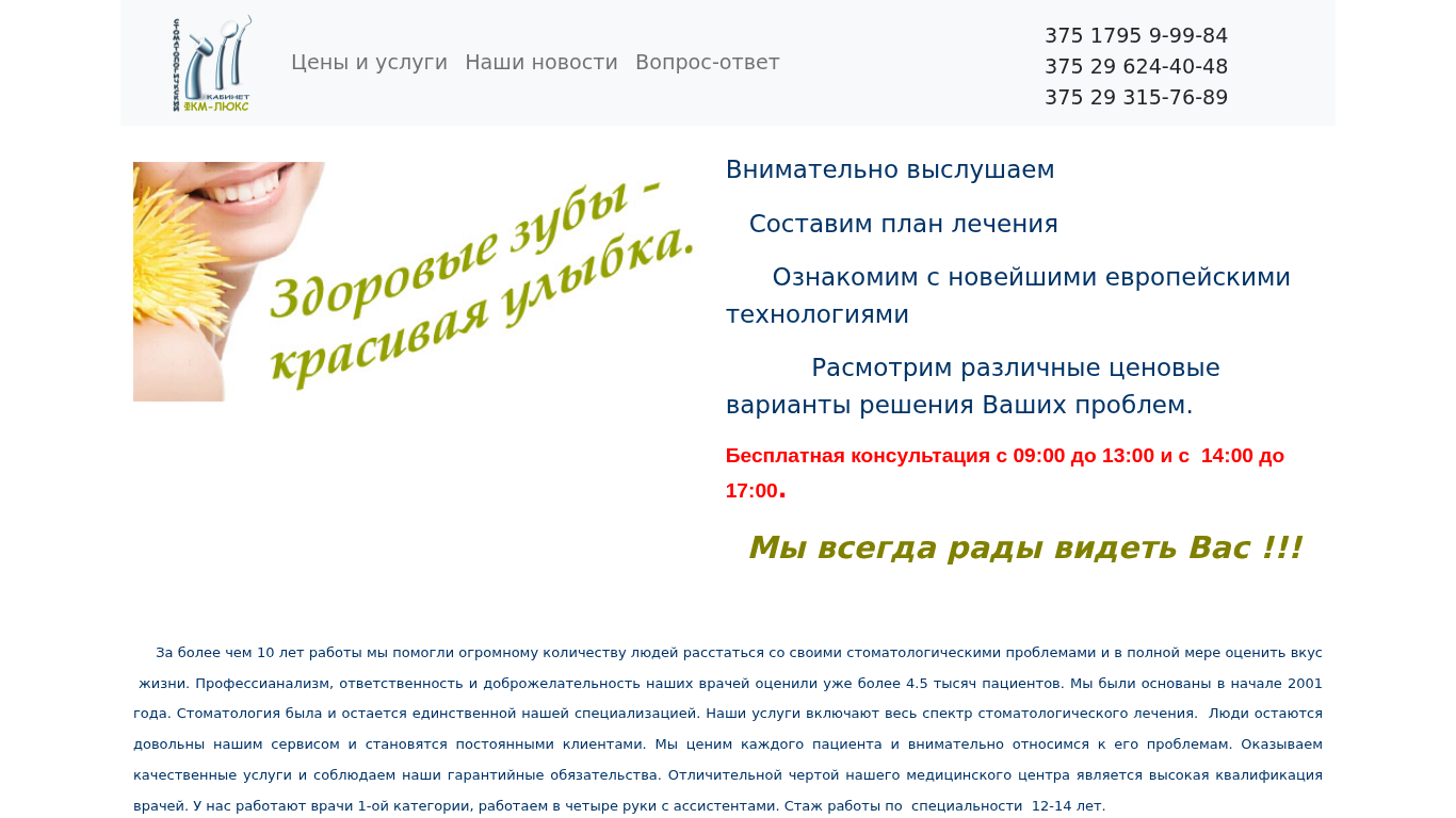 | SEO-описание | Беларусь. Слуцк. Стоматология. Кабинет ООО `ФКМ-Люкс` |