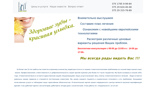 | AI-анализ | The portal is a Belarusian dental clinic website, named "ФКМ-Люкс" (FKM-Lux), located in the city of Slutsk. The website offers various dental services, including therapeutic treatment, dental prosthesis, and hygiene procedures. It emphasizes the use of modern materials and advanced technology in its treatments. The clinic was founded in 2001 and has been focusing exclusively on dental care since then. The team consists of highly qualified dentists, with a minimum of 12 to 14 years of experience in their field. The clinic is centrally located in Slutsk, making it easily accessible. The website provides information on prices, services, and contact details, along with a consultation service. |