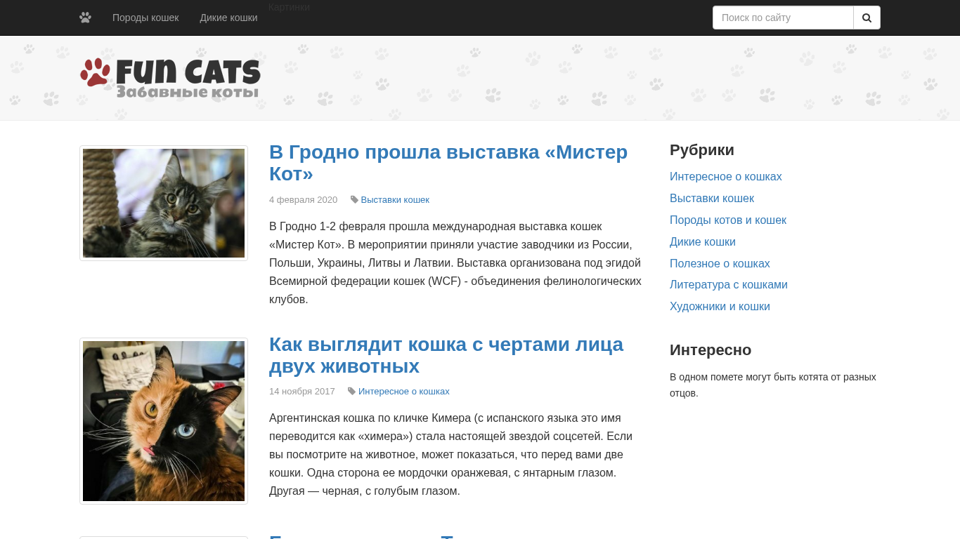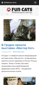 | AI-анализ | The web project Fun Cats is dedicated to cats and kittens. It offers information on various cat breeds, wild cats, reports from cat shows, advice on care and maintenance, interesting articles, literature, paintings and drawings featuring cats. The site includes sections on 'Fun Cats' (entertaining cats), 'Breeds of Cats' (cat species), 'Wild Cats' (untamed felines), 'Cartsinki' (paintings), and 'Exhibitions' (cat shows). The site mentions a cat show named 'Mister Kot' that took place in Grodno, Belarus on February 4, 2020, and features articles about an Argentinian cat with two distinct facial features, homeless cats in Tokyo, and a woman and her cat embarking on a worldwide voyage. Additionally, there is a section for an artist named Vladimir Sim |
