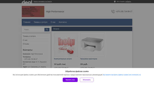 | AI-анализ | The portal "High Performance" is a Belarusian business website, featuring contact information, products, and services. The company's contact details include a phone number with country code +375 and area served set to BY, with the number being (29) 724-08-27. The website also provides a street address in the city, with the postal code and locality being unknown. The business offers a range of services and sells various products. Keywords associated with the site include 'high performance', 'услуги' (services), 'товары' (goods), 'реестре' (registry), and 'контакты' (contacts). The site appears to use the Deal.by platform for its infrastructure, as evidenced by the presence of Deal.by-specific code in the data. |