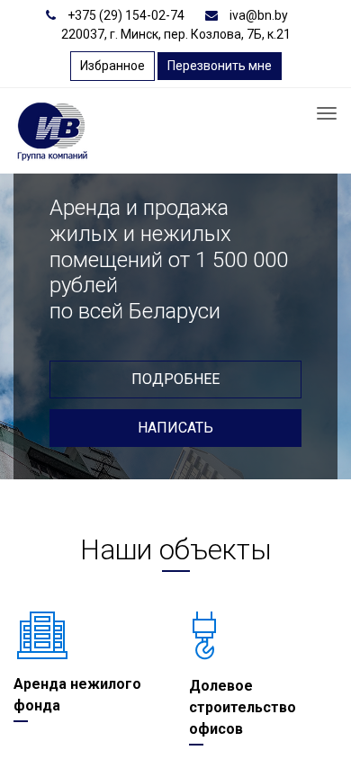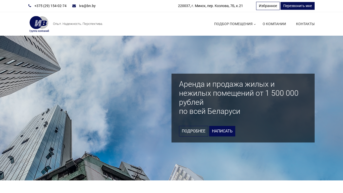 | SEO-описание | Аренда, продажа от группы компаний «ИВ» - крупнейшего застройщика в Минске. Подбор, описание, фотографии объектов. |