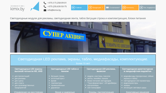 | AI-анализ | This portal is dedicated to selling various types of LED modules, LED strips, and ready-made LED signs (marquee signs). The offered products include LED screens, LED panels, LED tape, media facades, laser projectors, and light balls, among others. The website also provides blocks of power supplies and LED drivers. The company's name is OOO Kimix and their contact information is provided. The website features categories for different product types and includes news, documentation, and technical support sections. |