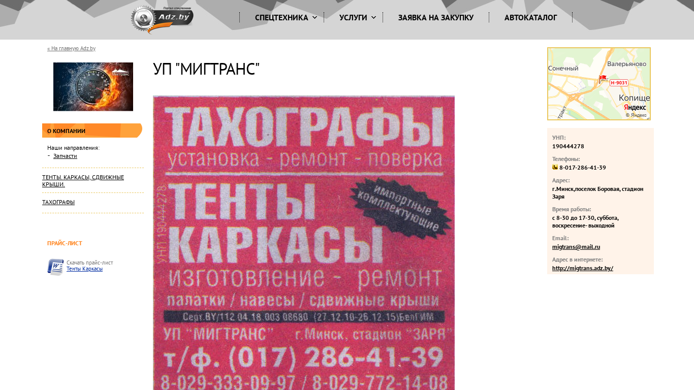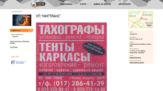 | AI-анализ | The website "УП "МИГТРАНС" is a business platform offering a range of services and products related to special technology, vehicles, equipment, and spare parts. The main keywords associated with the site include "мигтранс," "запчасти," "тенты," "каркасы," "прайс-лист," and "многие другие" (many other things). The company specializes in tents, carcasses, and moving roofs, as well as trucks and other heavy machinery. The website provides a price list for download, as well as information about rental, repair, credit/leasing, and cargo transportation services. The company's UNP number is 190444278, and contact information includes a phone number, email address, and physical address in Minsk. The website is operated by Adz. |