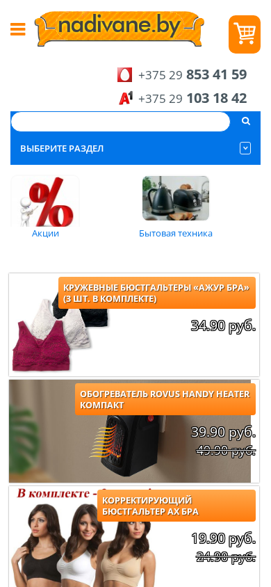| AI-анализ | The portal Nadivane.by is an online shopping mall offering delivery throughout Minsk and Belarus. The range of products includes home appliances, health and wellness items, personal care, kitchenware, electronics, automobile accessories, and more. Prices are low, and regular promotions are available. The site includes sections for new arrivals, clearance sales, and gift ideas for men and women. The shopping cart and payment information are located at the top of the page, along with links for order formation and product search. The site offers delivery and payment options, as well as customer support by phone. Categories include health and fitness equipment, massage chairs, skin care, weight loss products, and household items. The site is available in Belarusian and Russian languages. |