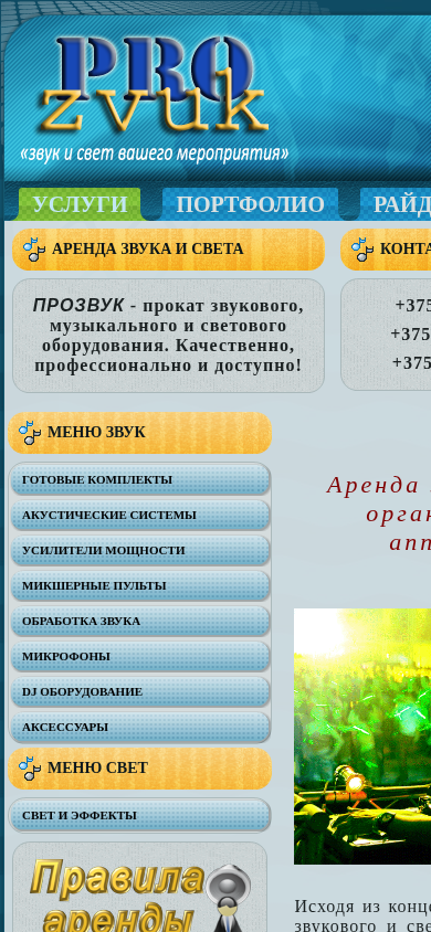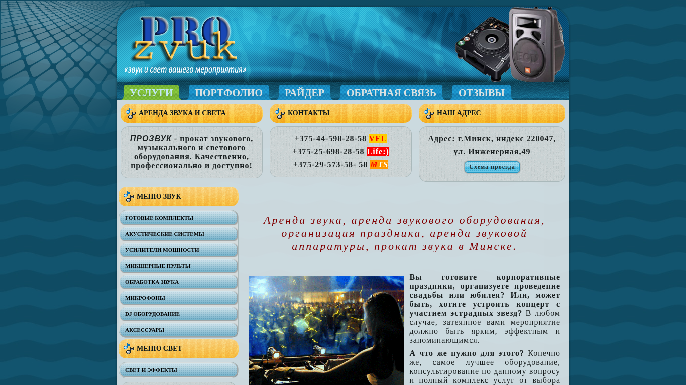 | SEO-описание | Аренда звука, аренда звукового оборудования, организация праздника, аренда звуковой аппаратуры, прокат звука в Минске. |