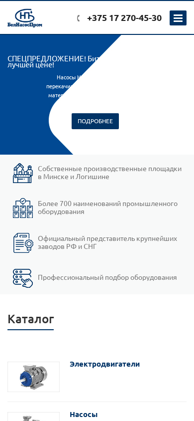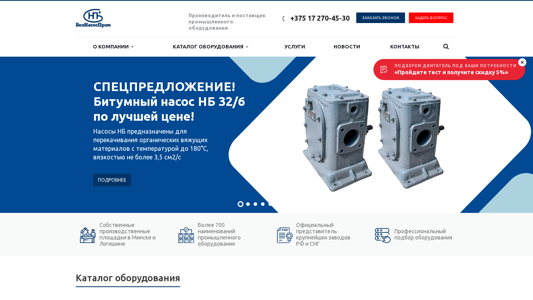 | AI-анализ | This website is for Belarusian industrial equipment company "БЕЛНАСОСПРОМ" (Belnasosprom). The title of the homepage is "ЗАО "БЕЛНАСОСПРОМ" - Главная" (JSC Belnasosprom - Main). The description states that the company specializes in providing a wide range of services to both corporate and private clients, with professionalism and responsibility being the key advantages. The website contains information about various types of equipment such as electric motors, pumps, compressors, ventilators, and motors reducers. The top words in the data include "электродвигатели" (electro-motors), "насосы" (pumps), "компрессоры" (compressors), "вентиляторы" (ventilators), "производитель |