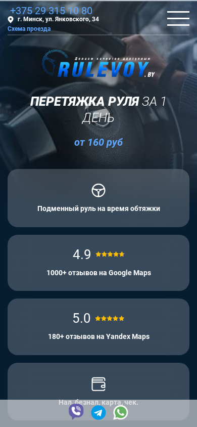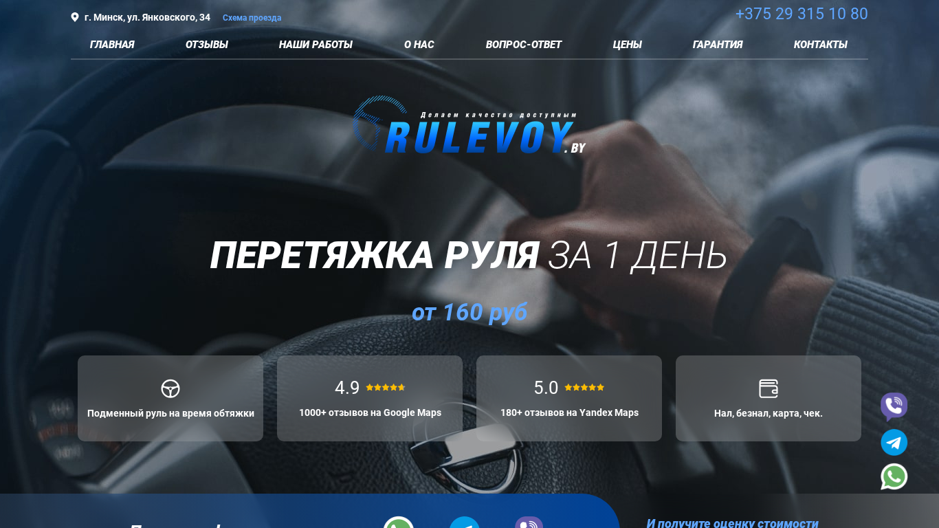 | AI-анализ | The portal rulevoy.by offers wheel alignment in Minsk, Belarus, allowing customers to have their steering wheels re-covered in one day. The website uses natural and eco-leather for the covering process, boasting over 970 reviews on Google Maps and having completed over 20,000 wheel alignments. The business provides a substitute wheel during the re-covering process and guarantees their work for 12 months. Customers can pay with cash, card, or check, and make a prior appointment by calling +375-29-315-10-80. The address is given as г. Минск, ул. Янковского, 34. The site uses jQuery for functionality and has a menu that slides down when the 'Меню сайта' button is clicked. |