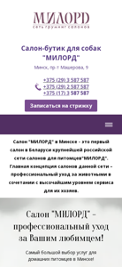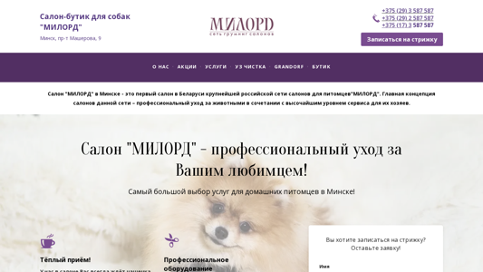 | AI-анализ | The web project "Салон-бутик для собак Милорд" (Milord Dog Salon-Spa) offers services for dogs. The title of the webpage includes this information. The most frequently used words in the metadata include: ruб (rubles, Russian currency), информацию (information), записаться (to register), комплекс (complex), персональную (personal), ваша (your), 587 (likely a phone number), третьим (third), лицам (people), имя (name), полный (full), заявку (application), телефон (phone), передаем (we pass), милорд (Milord), вас (you), время (time), вами (for you), оформить (to make official) and спасибо (thank you). The webpage |