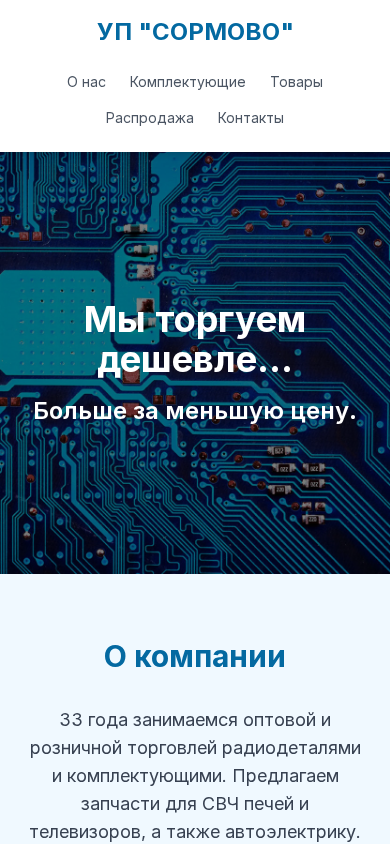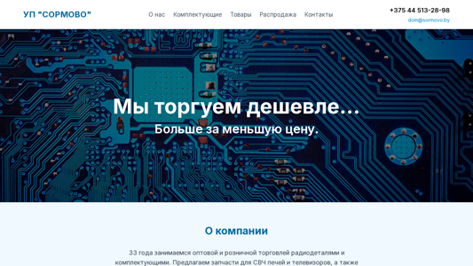 | SEO-описание | УП СОРМОВО - 33 года на рынке радиодеталей и комплектующих. Запчасти для СВЧ, телевизоров, автоэлектрика. Распродажа. Минск, ул. Никифорова 41. |