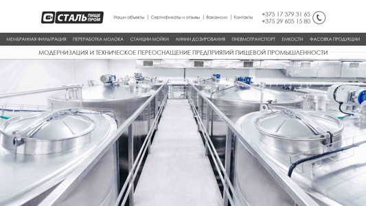 | AI-анализ | The web project "Stalprom.by" is a Belarusian company, Stalpiщепром Minsk, specializing in the production of stainless steel tanks, filtering installations, milk reception posts, CIP washing systems, packaging equipment, and pneumatic transport. The company was founded in 2010 and has grown into a manufacturer of automated production systems for the entire food industry. Stalpiщепром Minsk also produces equipment and automated systems for the dairy industry, including milk filtration systems, milk reception and processing lines, CIP washing systems, in-line pasteurization systems, and pneumatic transport systems for powdery products. In the food industry, the company works with numerous confectionery factories in Belarus. They manufacture premix lines, dosing and microdosing lines, vertical and horizontal stainless steel tanks, agitators, service |