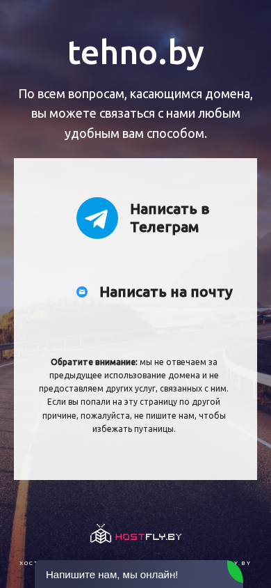 | AI-анализ | The website tehno.by is currently for sale. For all inquiries regarding the domain, please feel free to contact us via Telegram, email or any other convenient method. Please note that we do not assume responsibility for any previous use of the domain and do not offer any related services. Hostfly, a separate entity, provides hosting and domain parking services at www.hostfly.by. |