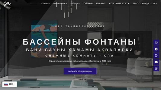 | AI-анализ | The web project Techinvestservis is dedicated to construction services for pools, fountains, aquaparks, hammams, saunas, and snow rooms. The company has been operating in Belarus since 2000. The website provides information about the services offered, with a focus on building pools and aquaparks. It includes a contact e-mail address for obtaining consultations. The website uses Google Tag Manager for tracking and analytics. The primary image on the page shows a swimming pool. The website is in Russian and is part of the Techinvestservis organization. |