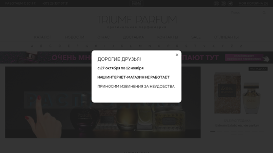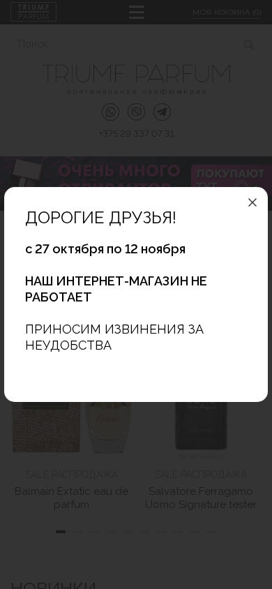| SEO-описание | Интернет-магазин Триумф Парфюм. Бесплатная доставка по Минску и Беларуси. Духи, туалетная вода. Только оригинальная парфюмерия. ☎ 375 29 337-07-31 |