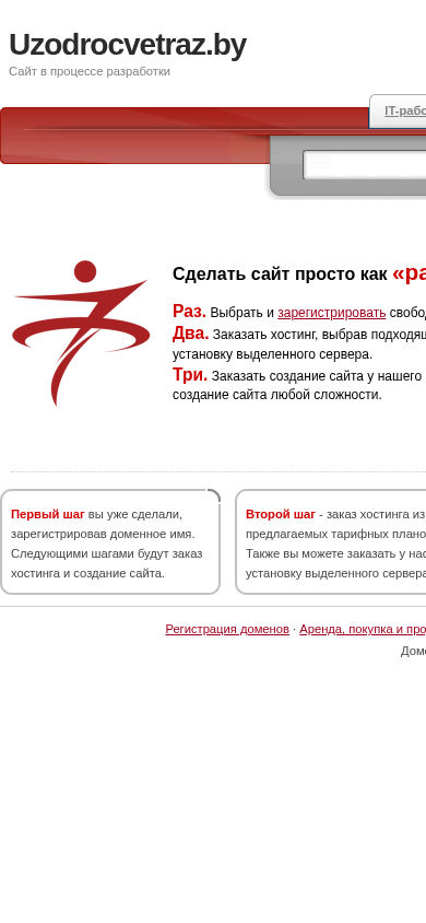 | AI-анализ | language: BY The portal Uzodrocvetraz.by is a website under development in the Belarusian language, focused on domain registration services. Users can register a free domain name, order hosting, and commission the creation of a website. The website offers various tariff plans for hosting and the option to purchase a dedicated server. The site also provides a WHOIS service for checking domain availability and a list of expiring domains in the .RU and .RF zones. The domain uzodrocvetraz.by is registered through i7.RU. |