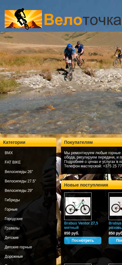| AI-анализ | The website Velotochka.by offers bicycles for sale in Gomel at affordable prices with installment plans. The selection includes mountain, road, children's bicycles, as well as their parts and accessories. The website also provides repair services. The main categories are BMX, fat bike, bicycles with 26", 27.5" and 29" wheels, hybrids, mountain bikes, city bikes, gravel bikes, children's bikes, tricycles, and foldable bicycles. Accessories include shock absorbers, forks, wheels, pedals, handlebars, seats, chains, cassettes, tires, spoke nipples, rims, hubs, brakes, and brake cables, among others. |