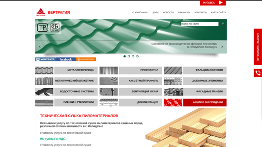 | AI-анализ | The web project "Вертрагия" is a Belarusian metal roofing, profiled sheet, mansard windows, and flat roofing company. The website provides information about the company, prices, news, vacancies, contacts, and a site map. The company has been successful for over 20 years, offering reliable and high-quality roofing materials, including metal roofing, profiled sheets, flat roofs, metal shafting, cassette profiles, and various accessories. They also provide services for the technical drying of pine wood materials and offer ventilation systems, facade panels, insulation materials, and documentation. The company has production and warehousing in Minsk and various representative offices in different cities in Belarus. The website includes contact information and operating hours. |