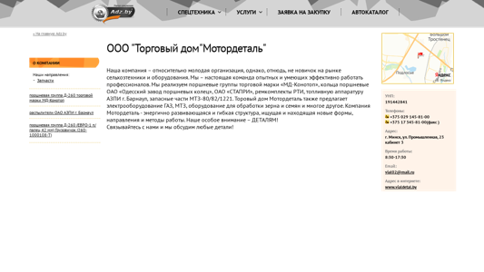 | AI-анализ | The website "ООО "Торговый дом"Мотордеталь" is a Belarusian business specializing in the sale of agricultural machinery and equipment parts. The company offers a variety of products including porshnevye groups (D-260, MД-Конотоп) from various manufacturers such as ОАО АЗПИ, STAPRI, and Одесский завод поршневых колец. Additionally, they sell reмонтные топливные аппараты from АЗПИ г. Барнаул, and запасные части for MТZ-80/82/1221. The company also deals with электрооборудование for ГАЗ and МТЗ, as well as equipment for processing grains and seeds. The company is a developing and |