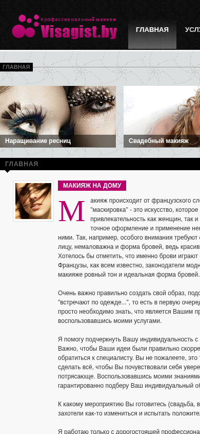 | AI-анализ | --- The web project "Visagist.by" offers professional make-up services with home visits in Minsk. The title includes the phrase "Макияж на дому" (Make-up at home), highlighting the convenience of the service. The description mentions "Фото, цены, отзывы" (photos, prices, reviews), suggesting that the website provides visual examples, cost information, and customer feedback. The keywords include "макияж" (make-up), "ресниц" (eyelashes), and "наращивание" (lash extension), among others. The text emphasizes the importance of make-up in enhancing natural beauty and discusses the significance of eyebrows and their role in framing the face. The French influence on make-up trends is noted, with a focus on even skin tone and properly shaped eyebrows. The website promises |