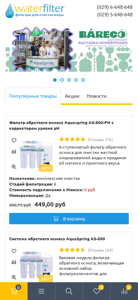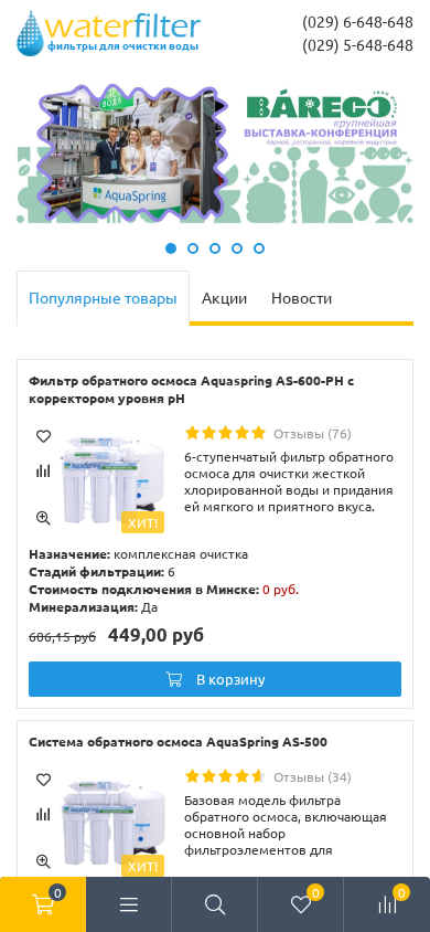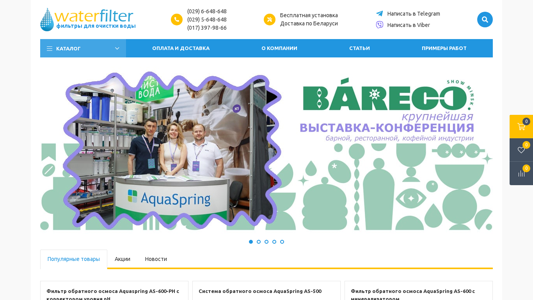 | AI-анализ | This website is an online store specializing in water filtration systems and related equipment in Belarus. The store offers over a thousand models of water filtration equipment and filtering materials, with delivery available throughout Belarus. The website provides phone numbers for contact: (029) 6-648-648, (029) 5-648-648, and (017) 397-98-66. The store offers free installation and delivery. The catalog includes various categories such as filters for kitchens, reverse osmosis systems, filters-attachments to the tap, water filters for the main line, filters for cold and hot water, filters for showers, filters for washing machines, systems for water purification at home, Ultramix, water softening, industrial reverse osmosis, Promix, Aqua |