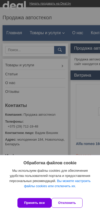 | AI-анализ | The web project "За стеклом.деал.бы" (za-steklom.deal.by) is a sales platform for auto windshields, contact information, products, and services for the company "Продажа автостекол" (Sales of Auto Windshields) located in Novopolotsk, Belarus. The website is under development and includes a list of available auto makes such as Alfa Romeo, BMW, and Citroen with models and prices for windshields, listed under the "Товары и услуги" (Goods and Services) tab. Contact information for the company, including a phone number (+375 (29) 712-19-48), address, and email address are provided on the "Контакты" (Contacts) tab. The website also |