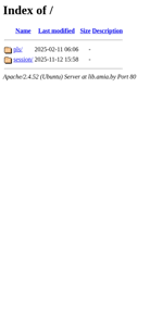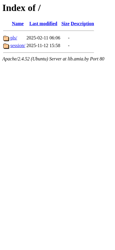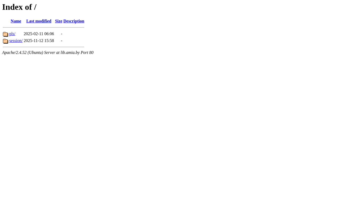 | AI-анализ | This online resource, lib.amia.by, is a web server that runs on Apache 2.4.52 software and is located on Ubuntu operating system. The home page lists files under the directories "pls" and "session", last modified on February 11, 2025, and November 12, 2025, respectively. The size and descriptions of these files are also displayed. The server is accessible on port 80. |