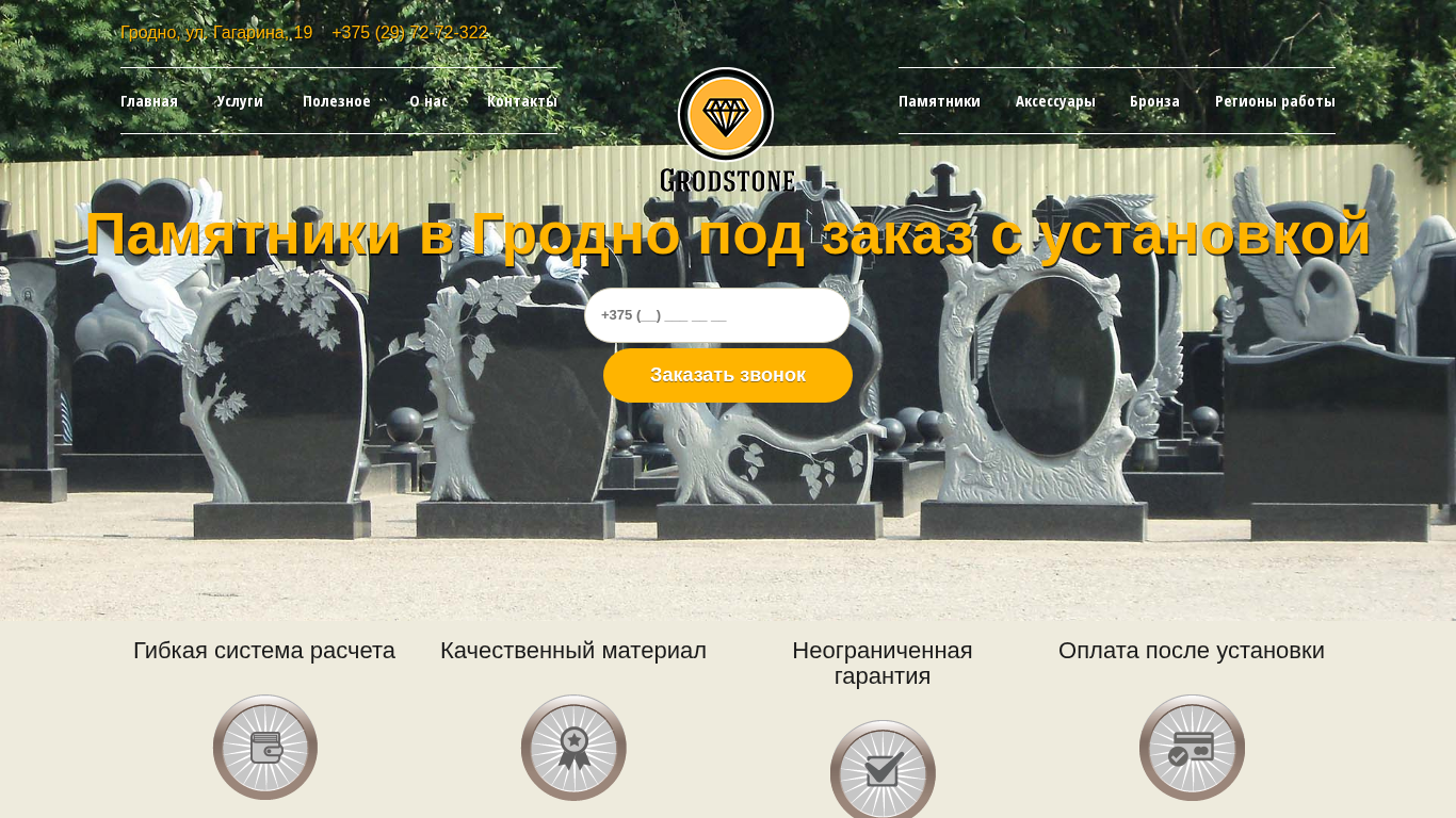 | SEO-описание | Памятники в Гродно от собственного производства — натуральный гранит — изготовление под заказ — гарантия качества — установка и доставка по городу и области. |