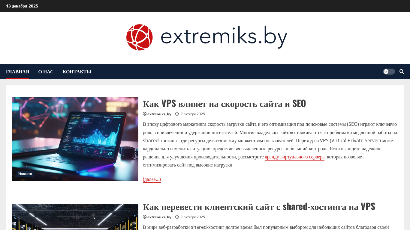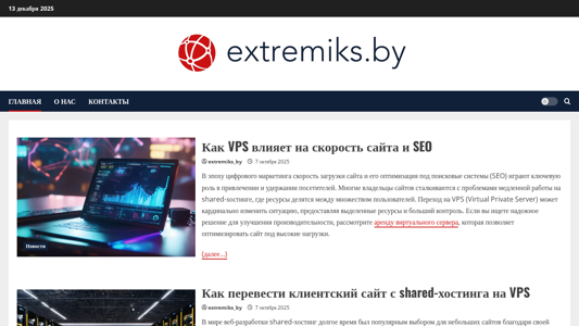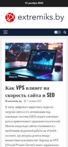 | AI-анализ | The web project 'extremiks.by' offers hosting and VPS services in Belarus, along with website development and promotion with a quality guarantee. The emphasis is on reliable hosting, fast VPS, and SEO optimization. The site provides information on how VPS affects site speed and SEO, as well as instructions for transferring a client site from shared hosting to VPS. Other topics include image optimization and CDN usage for faster loading times. |
