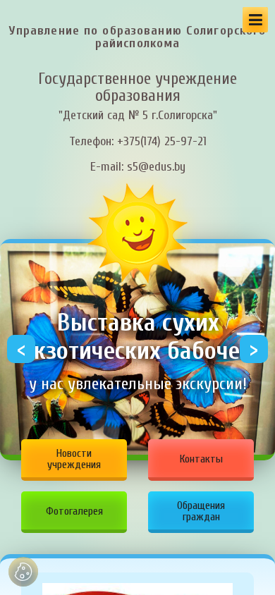 | AI-анализ | The portal sad5.edus.by is a website dedicated to the Kindergarten No. 5 in the city of Soligorsk, Belarus. The title of the website reflects its purpose, and the description includes common keywords related to educational institutions, work, and the city of Soligorsk. The website appears to provide news and contacts for parents, as indicated by the occurrence of the words "новости" (news) and "контакты" (contacts) among the top words. The website also includes a photo gallery and a graphic or schedule, as suggested by the words "фотогалерея" (photo gallery) and "график" (graphic or schedule). The Ya.Metrika tracking code suggests that the website is part of the edus.by domain and is being monitored for web analytics. The website design is modern and follows a clean and |