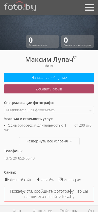 | AI-анализ | The portal is a photography website by Maxim Lupach, based in Minsk, Belarus. The website features a catalog of photographers, with Maxim Lupach listed under the category of 'Individual Photo Shoots'. He specializes in interior photography and offers his services in Minsk, as well as in other major cities such as Gomel, Vitsebsk, Grodno, Orsha, and Brest. The website provides information on the photographer's pricing and contact details, including a phone number and social media links. The site also includes a gallery of Maxim's work, showcasing his individual photo shoots. |