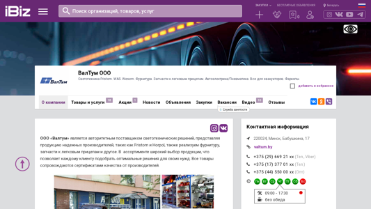 | Название / Заголовок | ВалТум ООО - Светотехника Fristom. WAS. Wesem. Фурнитура. Запчасти к легковым прицепам. Автоэлектрика/Пневматика. Все для эвакуаторов. Фаркопы.. 220024, Минск, , Бабушкина, 17 |