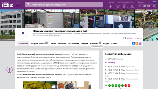 | AI-анализ | The website is for Житковичский моторостроительный завод OAO, a manufacturer based in Житковичи, Belarus. The company specializes in producing шестеренные насосы (gear pumps) for use in agricultural machinery and equipment, as well as components for diesel engines and aviation products. Their product range includes gears, shafts, and pumps. The company has modern equipment, machinery, and tools, with a mechanical assembly shop, aluminum casting unit, galvanizing plant, thermal treatment plant, and repair and maintenance service. Established in 1980, Житковичский моторостроительный завод OAO is the sole producer of gear pumps in Belarus and is part of the ОАО «Управляющая компания холдинга «М |