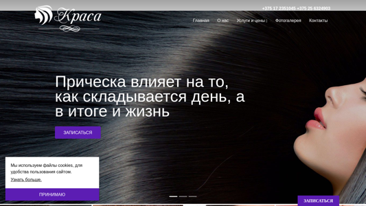 | AI-анализ | The website is a parlor offering various hairdressing services including haircuts, hair coloring, manicure, pedicure, and eyelash extensions. It is located in Minsk, Belarus, at Lогойский тракт 27. The website uses Hotjar for analytics and has phone numbers for contact (+375 17 2351045, +375 25 6324903, and +375 25 6324903). The services for men and women are highlighted, and the website has a photo gallery. Previous and next arrows are present for image navigation. The website is owned by ODO "KrasaBEL" and was founded in 2007. |