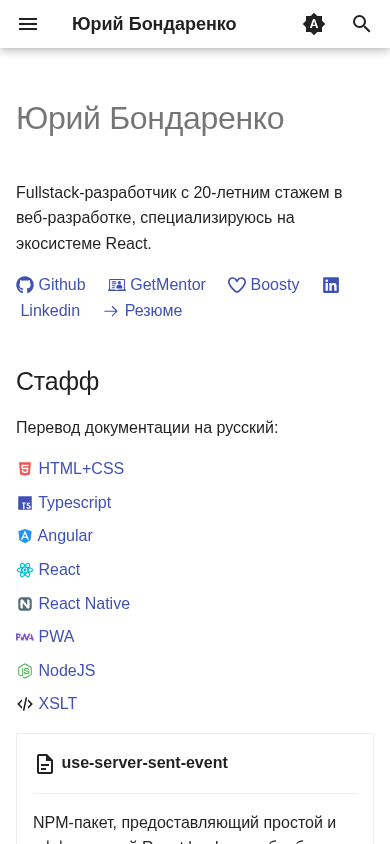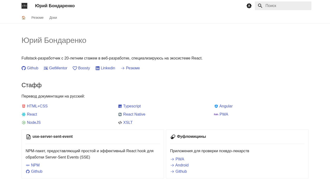 | AI-анализ | The website belongs to a fullstack developer named Yuri Bondarenko, with a 20-year career in web development focusing on the React ecosystem. The site contains documentation for various topics such as HTML+CSS, Typescript, Angular, React, React Native, PWA, NodeJS, XSLT, use-server-sent-event, and NPM. It also provides resources for creating effective agents and a guide to setting up an MCP-server for use with Claude for Desktop and other clients. The site offers translations of interesting articles and includes information on creating applications for checking pseudo-medicines as PWA for Android. The site was last updated on October 18, 2025, and includes links to Github, Boosty, and LinkedIn. |