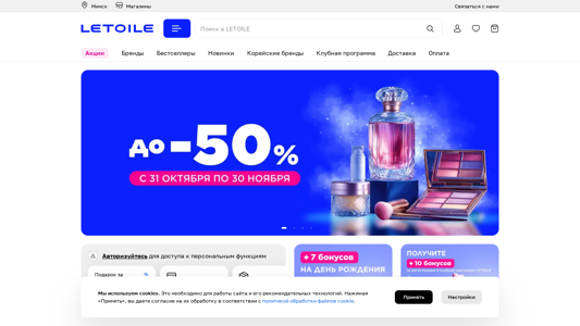 | AI-анализ | language: ru Country: Belarus --- This online resource is the official e-commerce store of LETOILE in Belarus. It offers a wide range of original products from various brands, some of which are exclusively represented by LETOILE. Customers can place orders for beauty and health items and choose between self-pickup or delivery within Belarus. Professional consultants are available 24/7 to provide excellent service and help with product selection. The site features categories for perfumery, makeup, skincare, body care, hair care, children's items, manicure and pedicure, home decor, and gifts. Popular brands include PAYOT, Giorgio Armani, Ultimate Moroccan Argan Oil, Attar, Banila Co, Mone Professional, L'Occitane Au Bresil, Innisfree, Influence Beaut |