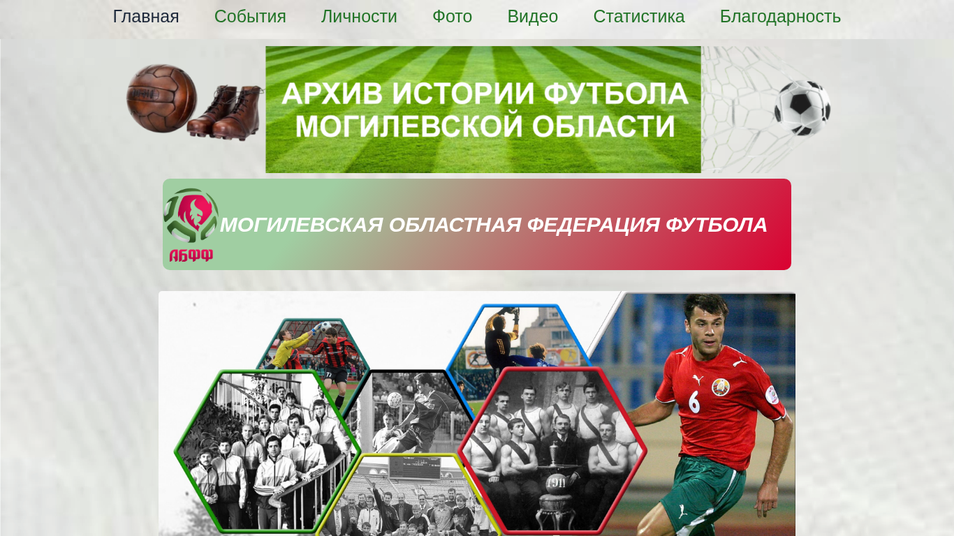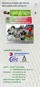 | AI-анализ | --- The web project "Archive of the History of Football in the Mogilev Region" is a Russian-language website dedicated to the sport of football in the Mogilev region of Belarus. The homepage features a main menu, a primary image, and a breadcrumb trail with the label "Главная страница" (Main Page). The website includes pages for various football-related topics such as events, personalities, statistics, photos, and videos. The organization responsible for the website is named "Архив истории футбола Могилевской области" (Archive of the History of Football in the Mogilev Region). The website is accessible at the URL <https://mogstoryfootball.by/>. |