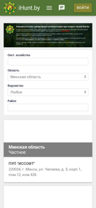 | AI-анализ | This website is titled "iHunt.by" and focuses on hunting activities in the Minsk region of Belarus. Keywords associated with the site include "ргоо" (forestry), "боор" (hunting ground), "минлесхоз" and "лесхоз" (forestry administration), and "охота" (hunting). The most frequently used words on the site are "минская область" (Minsk region) and "область" (region). The website design features a Material Design aesthetic, with a dark color scheme and prominent use of the color #857d32. The site also includes a bottom sheet menu with a list of links. |