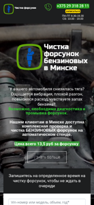 | AI-анализ | The web project "Chistka Forsunok" offers ultrasonic cleaning and diagnosis of fuel injection systems in Minsk, Belarus. The service includes cleaning of bензиновых (benzinevych) fuel injectors using an ultrasonic stand. Diagnostics and low prices starting from 22,5 рублей (approximately $0.82 USD) are mentioned. The business is located in the Fruzensky district, near the intersection of Победителей, Тимирязева streets. The website uses the Open Sans, Russo One, and Roboto fonts. The domain name is chistka-forsunok.mibro.by. |