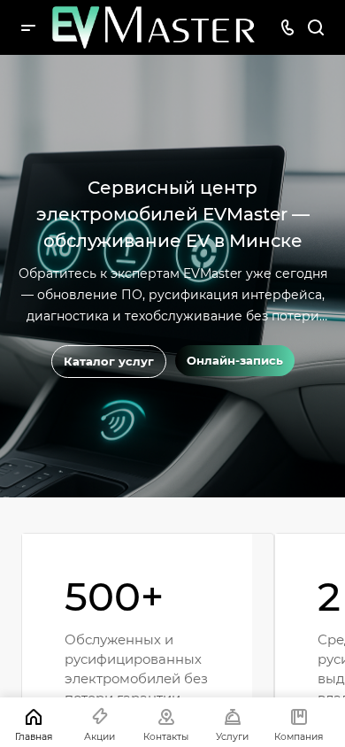 | SEO-описание | EVMaster — профессиональный сервисный центр электромобилей в Минске. Русификация, обновление ПО, диагностика и техобслуживание любой марки. Запишитесь сегодня и доверьте свой электро-авто экспертам! |
